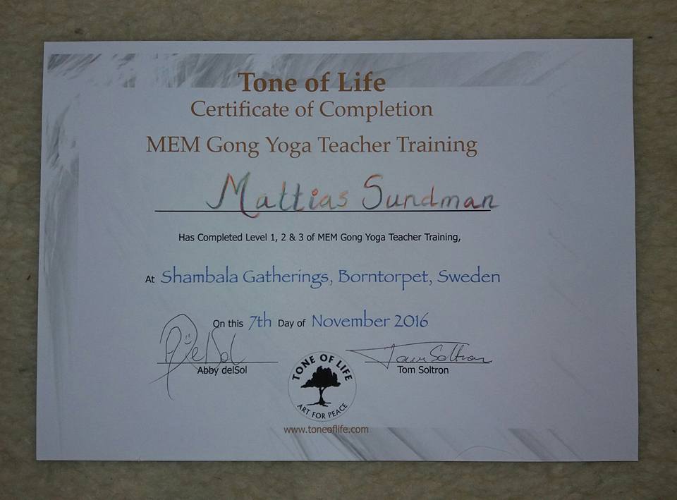 Har i början av nov 2016 gått den 3:e och avslutande kursen i MEM GONG-Yoga och har blivit fullutbildad MEM Gong-Yogalärare.